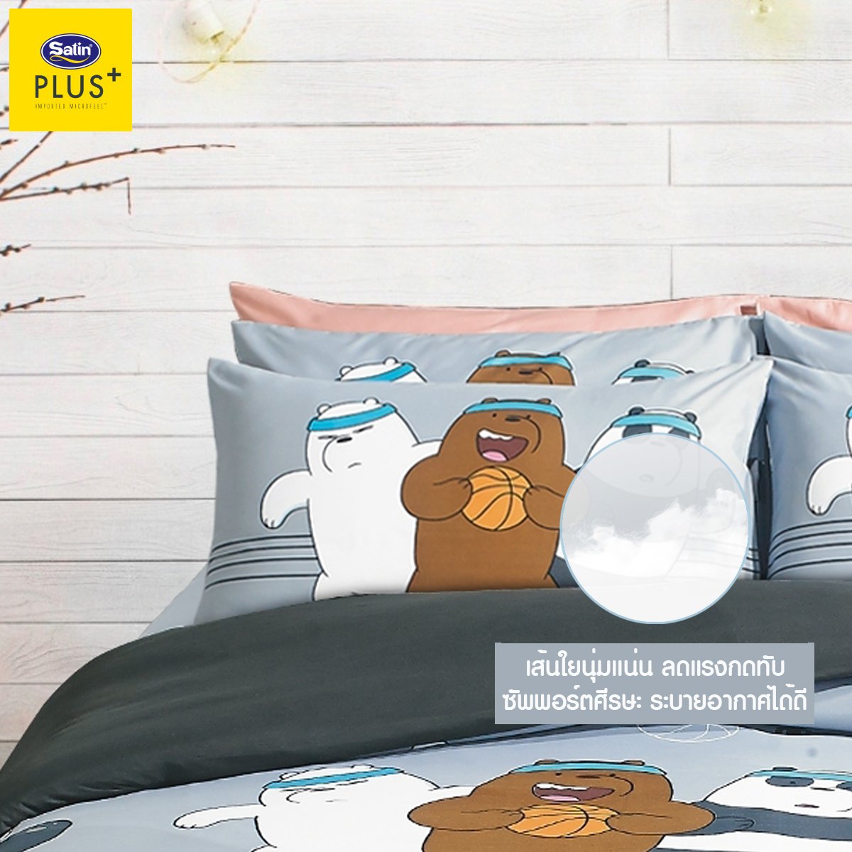 Satin Plus หมอนหนุน รุ่น Licenser We Bare Bears มอบสัมผัสพิเศษให้คุณพบช่วงเวลาแห่งความสุขในโลกแห่งความฝัน โดดเด่นด้วยดีไซน์สดใส เติมความน่ารักให้ห้องนอน เหมาะสำหรับทั้งเด็กและผู้ใหญ่ที่ชอบความอบอุ่นและสนุกสนาน เพิ่มชั่วโมงการหลับลึกของคุณให้ยาวนานมากขึ้นด้วยเส้นใย Polyester Pillow-Satin 100% (Class A) นวัตกรรมที่ผ่านการคิดค้นมาอย่างละเอียดแล้วว่าสามารถรองรับสรีระของศีรษะและลำคอได้อย่างสมดุลลงตัว