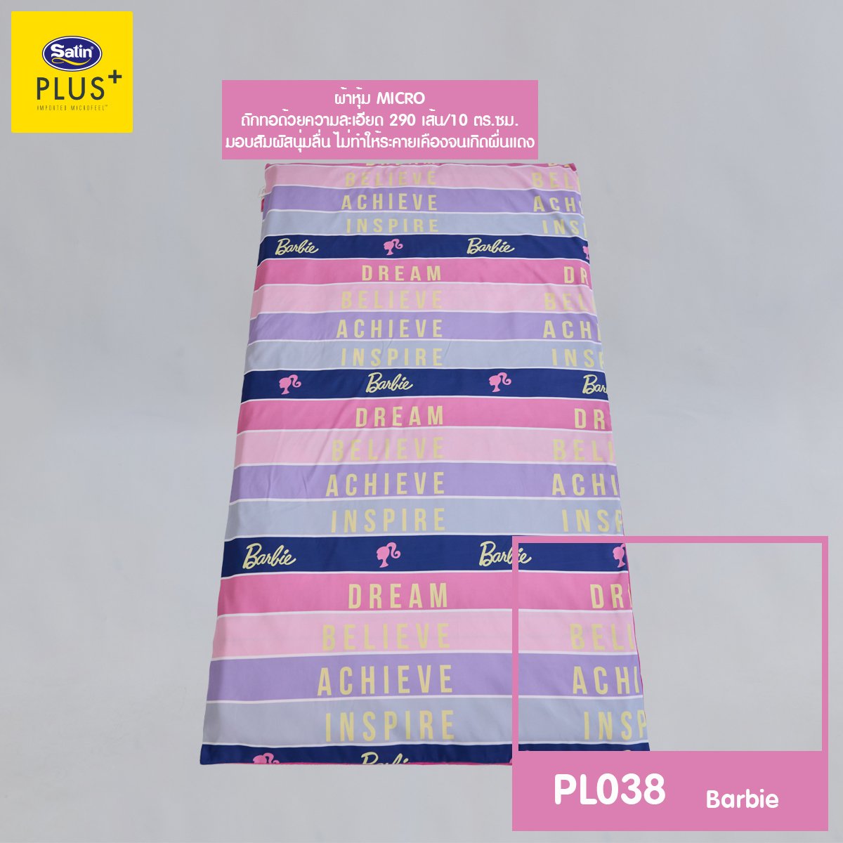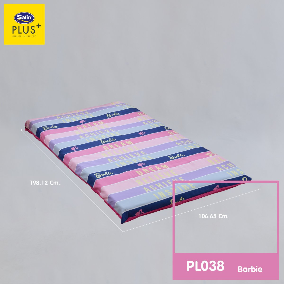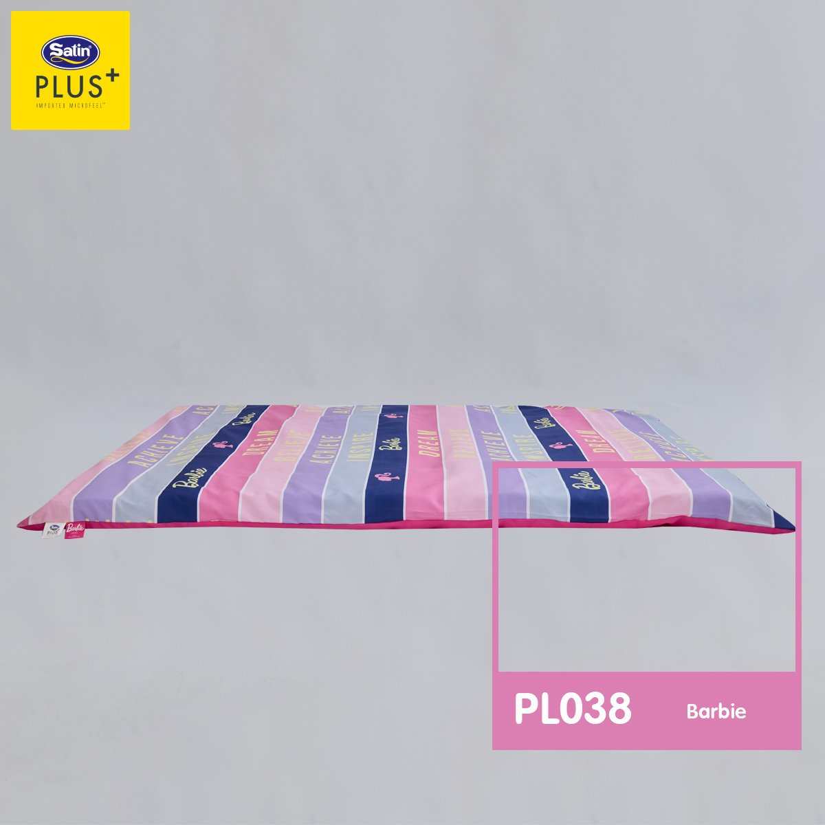 Satin Plus ปิกนิก มอบสัมผัสให้คุณพบช่วงเวลาแห่งความสุขในโลกแห่งความฝันกับลาย Barbie ลิขสิทธิ์แท้ สีพาสเทลหวาน พับเก็บง่าย ซิปถอดซักได้ เพิ่มความสดใสให้ห้องนอน เติมความสดใสและความสบายให้ทุกคืนของสาวกบาร์บี้ เพิ่มชั่วโมงการหลับลึกของคุณให้ยาวนานมากขึ้นด้วย ใย Pure Synthetic fibers-Satin (Class A) นวัตกรรมที่ผ่านการคิดค้นมาอย่างละเอียดแล้วว่าสามารถรองรับสรีระได้อย่างสมดุลลงตัว